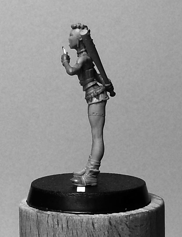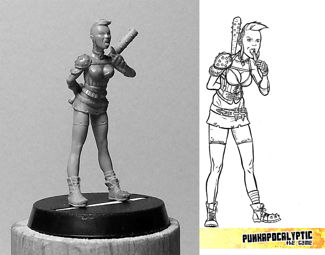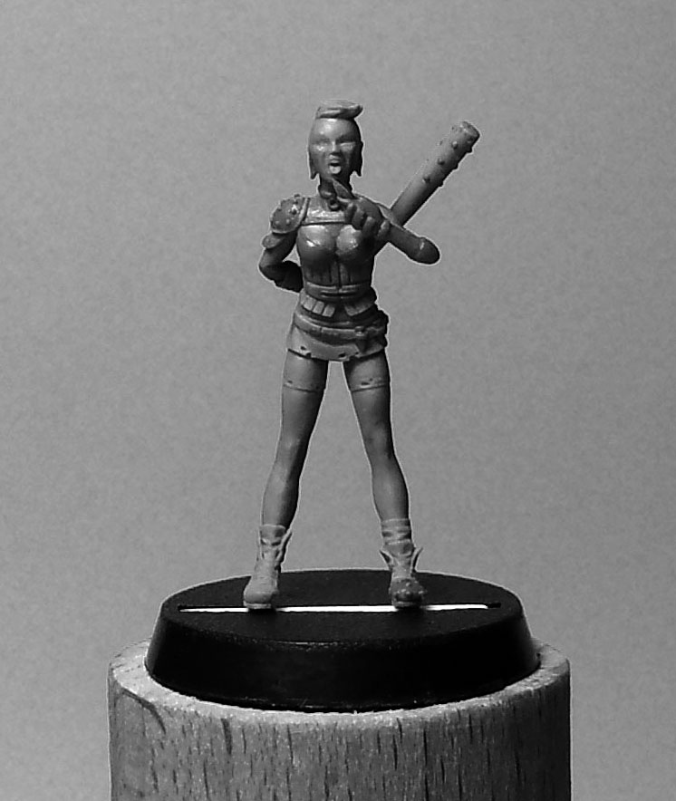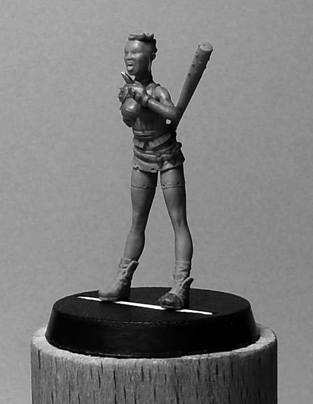 Por fin empiezan a asomarse las miniaturas de pandilleros. Os presentamos a una piltrafa armada con un bate y cuchillos arrojadizos. Miley Cyrus se sentiría muy orgullosa.
