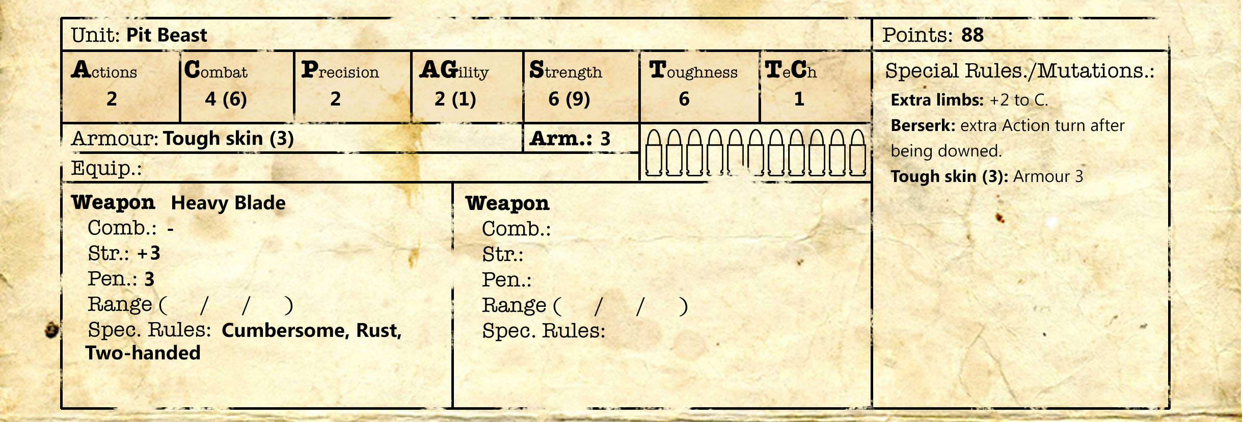 The Pit beast is the Mutard’s shock troop par excellence. Its only tactic is trying to get as fast as possible to the enemy, as it is capable of mopping out anything in its path. As it has a bigger than standard size it is more difficult to hide from enemy fire and will attract a lot of shooting, but its Toughness 6 means that even a successful rifle shot (Strength 6) must get a good die roll in the opposed roll to wound. Furthermore, its Berserk special rule gives it an extra Action turn even after being downed, in which the Pit beast can easily waste a nearby enemy before being taken off the table. This particular one is armed with a Heavy blade, a weapon that even though it imposes a -1 penalty to Agility for being Cumbersome also grants a Strength boost capable of destroying anyone. Combined with the Extra limbs mutation, this miniature gets a fairly decent Combat 6 attribute.