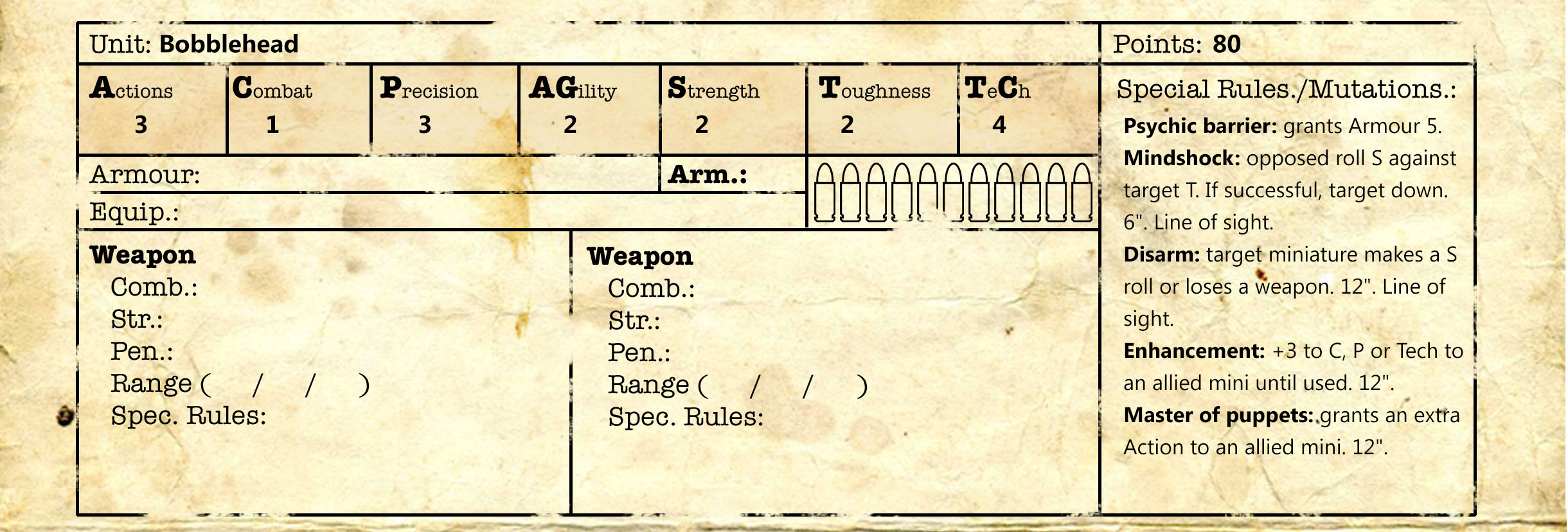 Psychic barrier grants the Bobblehead a great Armour value but keeping it active will force you to spend an Action each turn, leaving you with less options to do other things, so you will have to decide wisely when to use it.