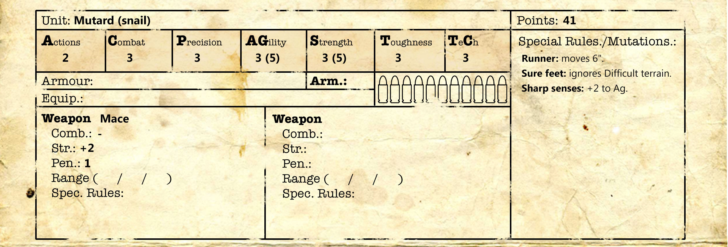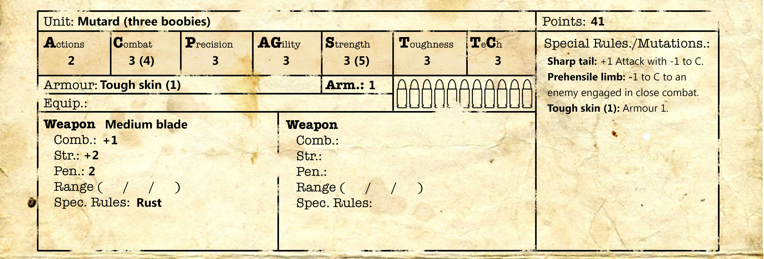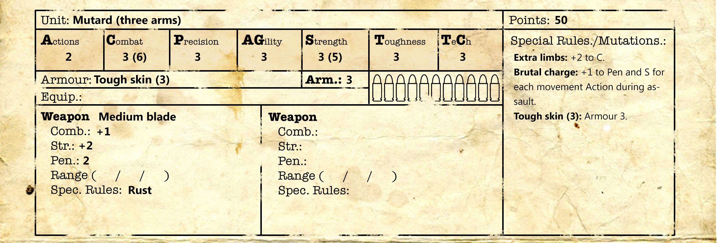 This is a Mutard specially bio-engineered for combat. The Extra limbs mutation, as well as the Medium blade it is equipped with, give it a quite impressive Combat 6 attribute. Besides, if it gets to assault an enemy, its Brutal charge mutation will not only improve its Combat attribute, but also its Strength (already boosted by the Medium blade) and Penetration. The Tough skin (3) mutation gives it some measure of armour if it gets hit.