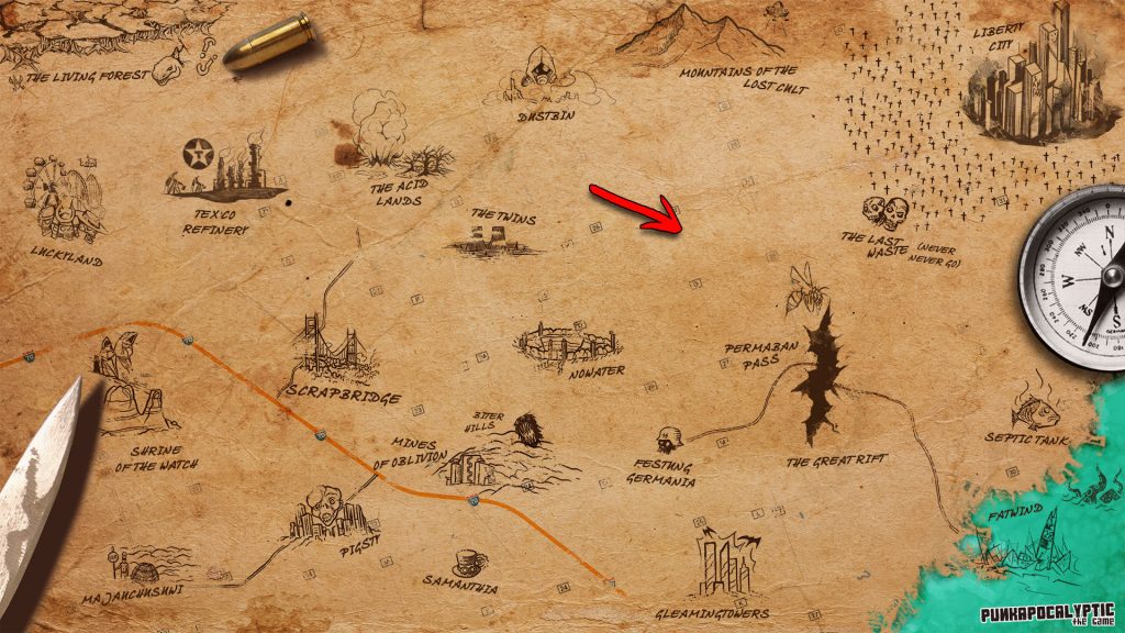 We know that one of the things that you like most about Punkapocalyptic is its background. So lately we had added more locations beyond the borders of our original setting map, as well as some more locations to the Scrapbridge zone in the last past days. But we still needed to put all those places on the map and update it, which we finally did during these holidays. So here you finally have the brand new and extended map of the surroundings of Scrapbridge… with a pretty big gap we notice now it should be filled with some other location. So, if you have any idea for this place we would love to hear your feedback about it. Let’s see if you can come with any weird, Punka-style and over-the-top suggestion, which we love more than our own thoughts.