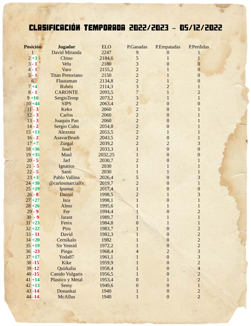Sabemos que en estas fechas se van a jugar muchas partidas, por lo que esperamos que en la próxima actualización se vea también mucho movimiento.