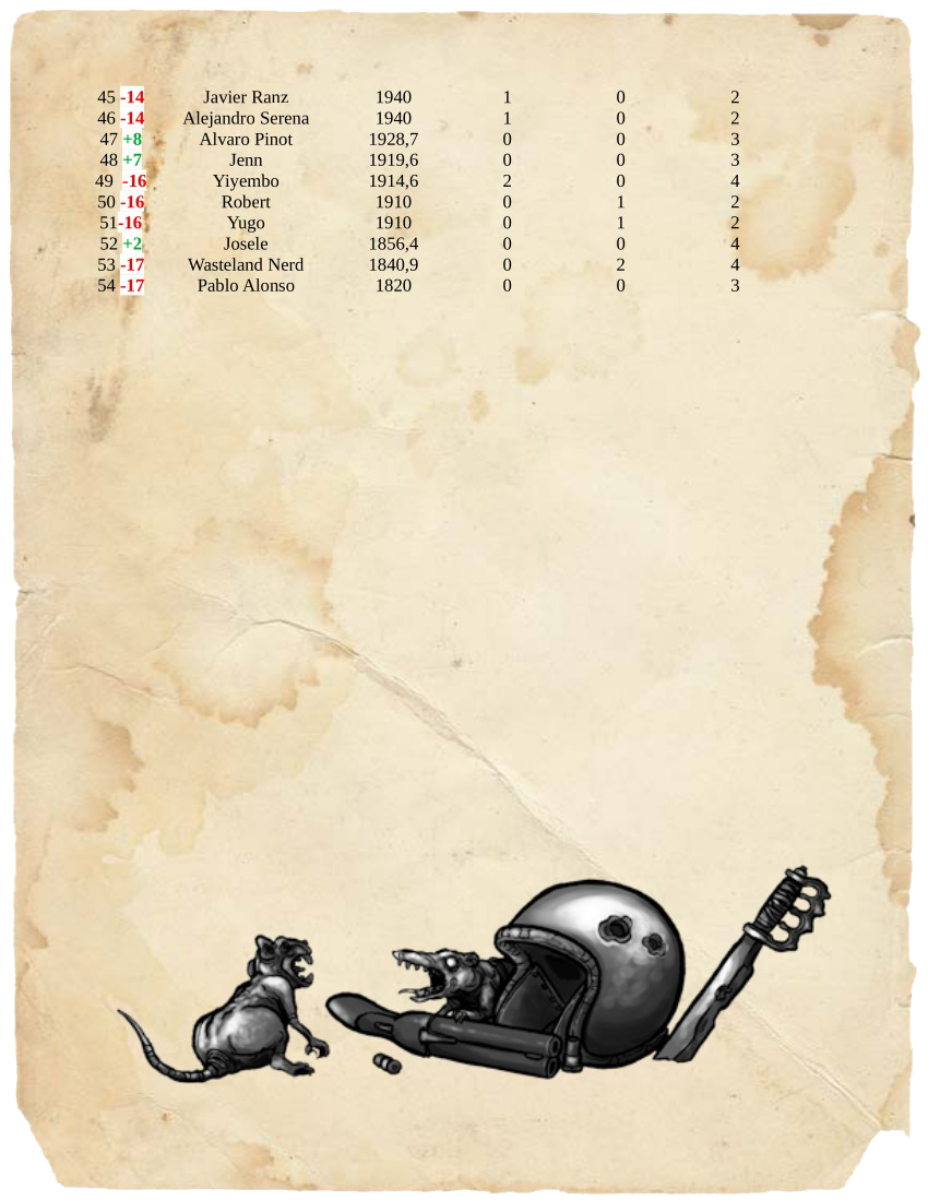 ¡54 Parameños y parameñas! Menuda banda tenemos ya reunida. Si nos centrásemos en derrocar a Cunnilingus en lugar de darnos de hostias otro gallo cantaría… ¡Aunque también mola ver las mesas llenas de sangre!