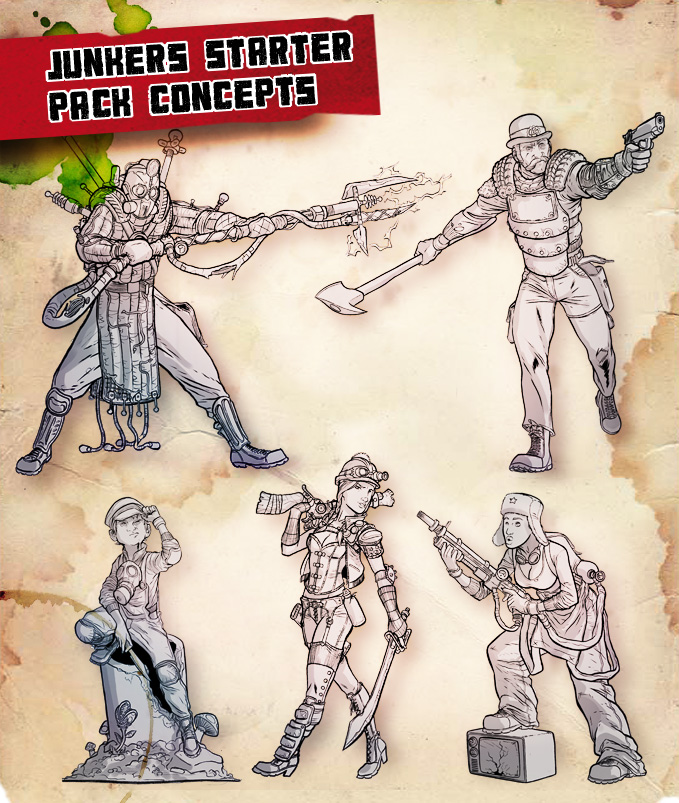 En la campaña de Indiegogo podéis conseguir las minis que teníamos en nuestro catálogo, pero el verdadero objetivo es conseguir sacar ya de golpe el Starter Pack de los Chatarreros, con cinco miniaturas totalmente nuevas, en metal blanco, con la producción de Bigchild Creatives. Y ya de paso, intentamos premiar a la gente con una miniatura exclusiva que nunca se va a vender en tiendas, Ochodedos, en resina y producida por RN Estudio.