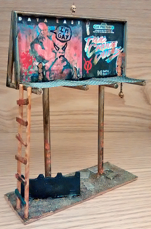 The sign poster (downloaded from the Internet and printed at home) is a homage to the «Two Crude Dudes» MegaDrive badass game, a 1990 post-apocalyptic hit starred by two greased pimps who roam the Wasteland beating the shit out of people. Weathered with even more Citadel washes, we teared some parts of it and made some graffiti worthy of a teenager with barely enough brain cells to make it through the day.