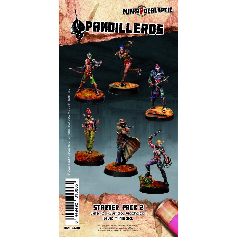 Pack compuesto por seis miniaturas de Pandilleros. Incluye Jefe (pistola y filo medio), Curtida (ballesta), Curtido (filo medio y protección contra la contaminación), Bruta (maza y escudo), Machaca (arco y protección contra la contaminación) y Piltrafa (maza ligera).