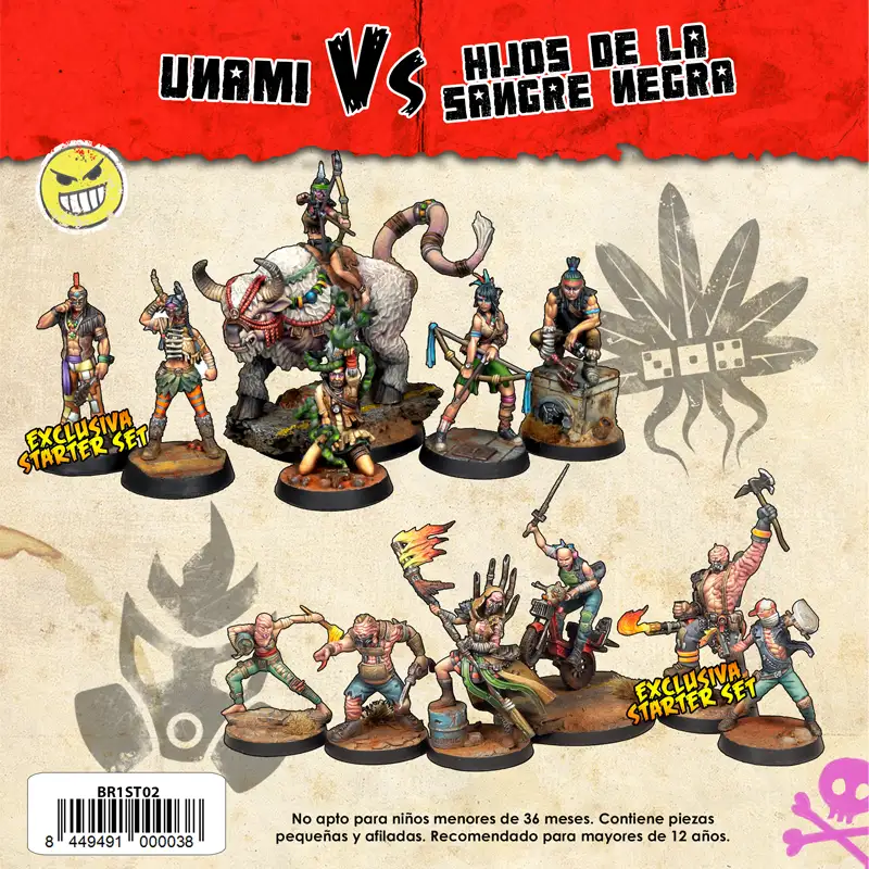 Este Starter Set para dos jugadores enfrenta a la nueva facción de los Unami contra los Hijos de la Sangre Negra, ofreciendo una forma directa de comenzar a jugar o de ampliar bandas ya existentes. La caja está pensada tanto para nuevos jugadores que quieran iniciarse en el juego como para veteranos que busquen incorporar nuevas miniaturas y opciones a sus colecciones. Puedes descargar en nuestra web una lista a 350 puntos de cada una de las dos facciones para que simplemente tengas que montar las miniaturas y ya puedas jugar.